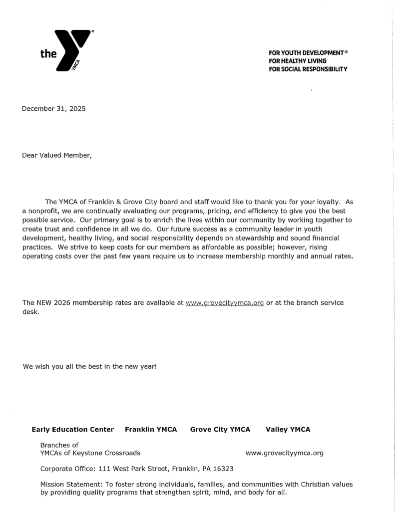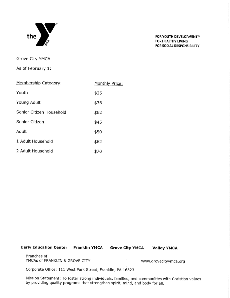 The Franklin / Grove City YMCA is a 501(C)(3) Non-Profit Organization. Donations are tax-exempt FEIN: 25-0995782